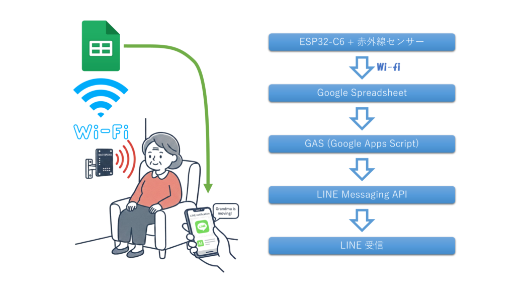 あとは赤外線センサーからスマホまでをどうやって繋いでいくかということを考えると次のような構成が扱いやすいと思います。